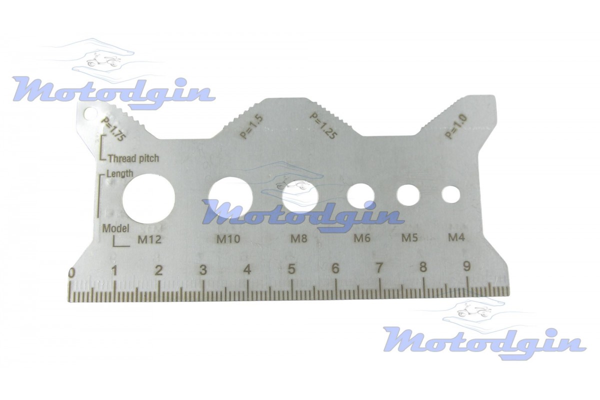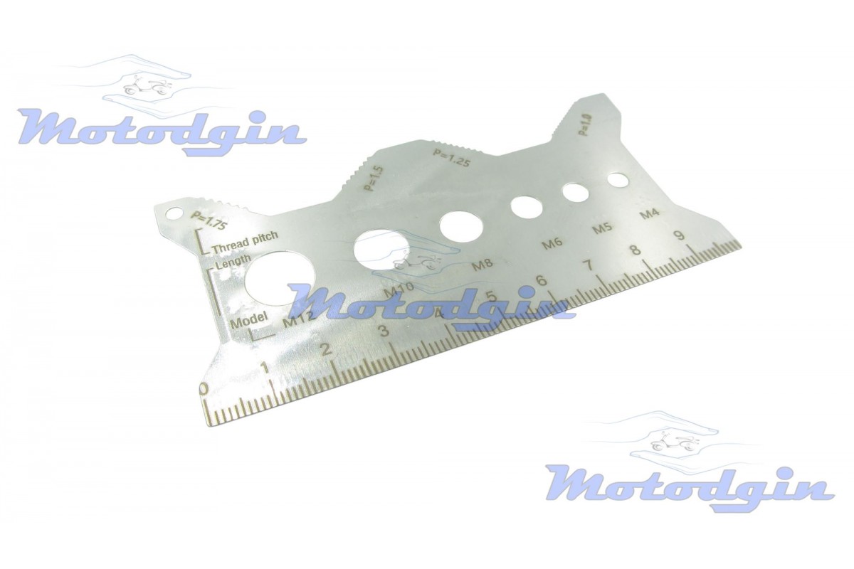 Різьбомір лінійка для заміру різьблення болтів і шпильок дозволяє заміряти довжину болта до дев'яти см, а також діаметр болта від чотирьох до дванадцяти мм. Цей різьбомір можна використовувати тільки із зовнішнім різьбленням крок від 1 до 1.75.