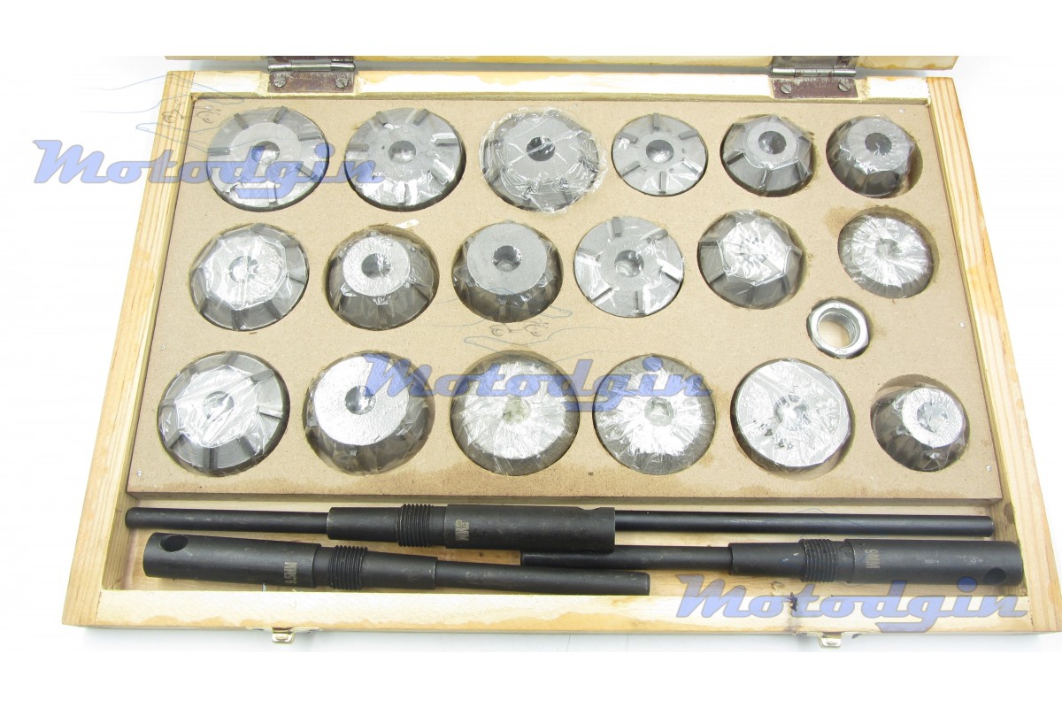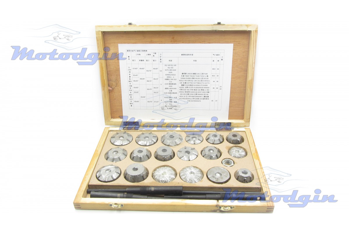 Набір шарошок в дерев'яному кейсі для ремонту сідла клапана, комплект включає вісімнадцять шарошок, три пілоти діаметром 8.0мм, 9.0мм, 9.50мм, вороток. Виробник - Китай MG