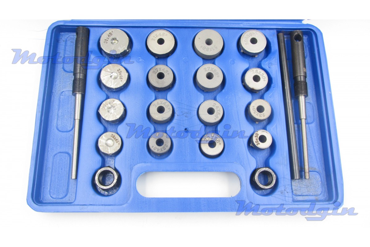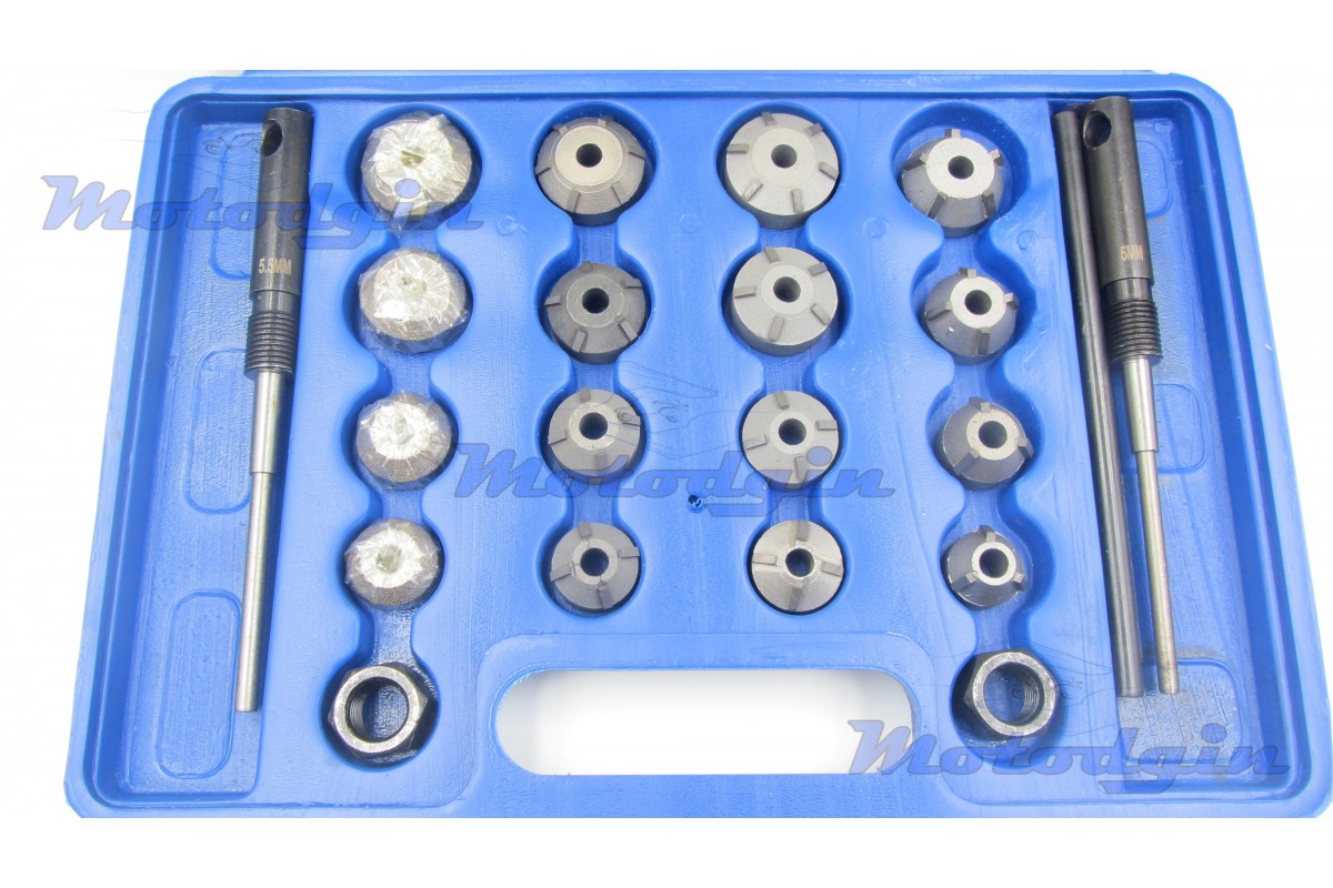 Набір шарошок у пластиковому кейсі для ремонту сідла клапана, комплект включає шістнадцять шарошок, два пілоти діаметром 5.0мм, 5.5мм, вороток. Цей набір спеціально розроблений для мототехніки. Відмінний набір шарошок для приватної майстерні з ремонту скутерів та мотоциклів.