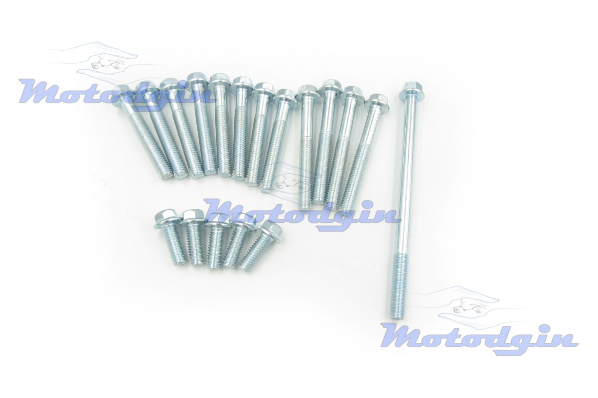 Набір болтів двигуна Delta MG, в наборі вісімнадцять болтів, діаметр М6, головка під ключ на 8. Довжина болта вказівна до капелюшка, п'ять болтів довжина 16мм, вісім 40мм, чотири 50мм, один 95мм. виробник - MG