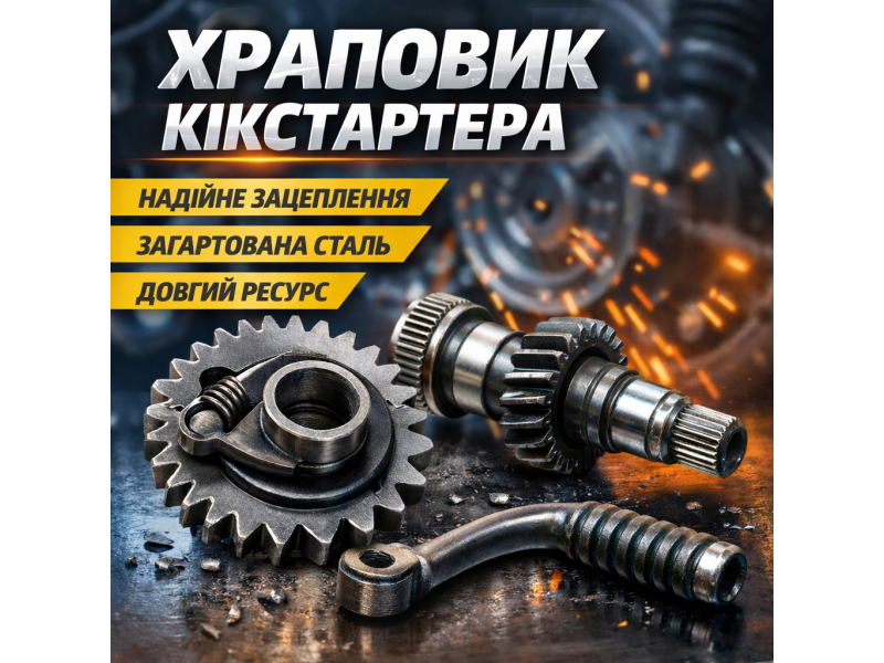 Під час натискання на кікстартер храповик входить у зачеплення із зубчастим механізмом і передає обертальний рух на вал. Після запуску двигуна він автоматично виходить із зачеплення, що запобігає зворотному удару та пошкодженню механізму.