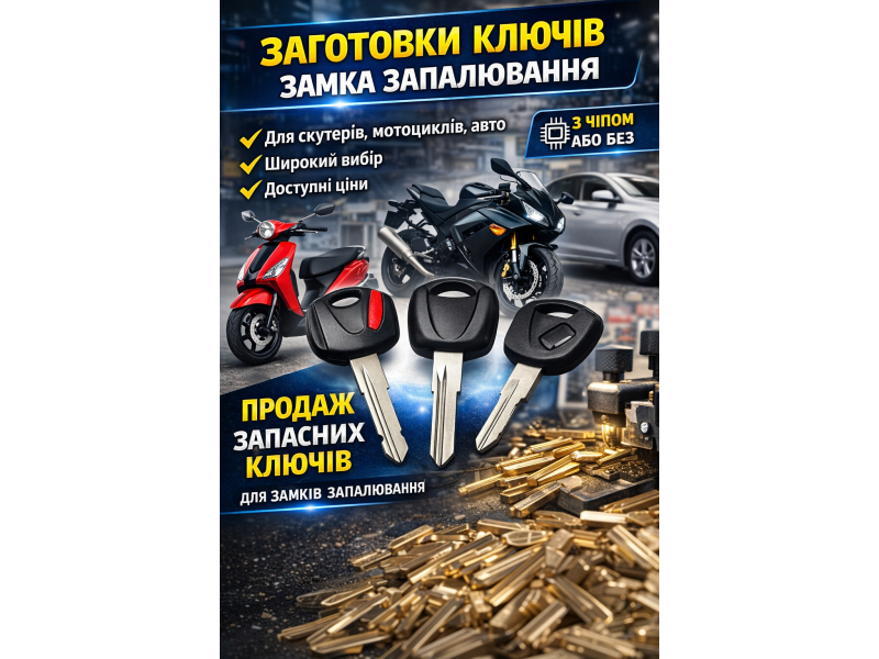 Заготовка ключа замка запалювання — це металевий ключ без нарізки, який використовується для подальшого виготовлення повноцінного ключа під конкретний замок. Такі заготовки застосовуються для мотоциклів, скутерів, автомобілів, квадроциклів та іншої техніки.