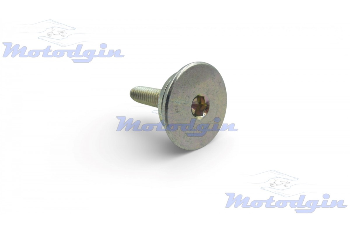 Болт кріплення стабілізатора ланцюга верхнього Yamaha Gear UA06J (BX50), Jog SA36 / 39J, Vino SA26J, VOX (Ямаха Gear UA06J, Jog SA36J, SA39J) Болт кріплення виготовлений з якісних матеріалів, повністю відповідає оригінальному болту, встановленому на заводі. Діаметр головки болта 23 мм, діаметр під ущільнювальне кільце 15 мм, діаметр різьби 6,0 мм, крок 1,0 мм. Виробник — Yamaha Тайвань