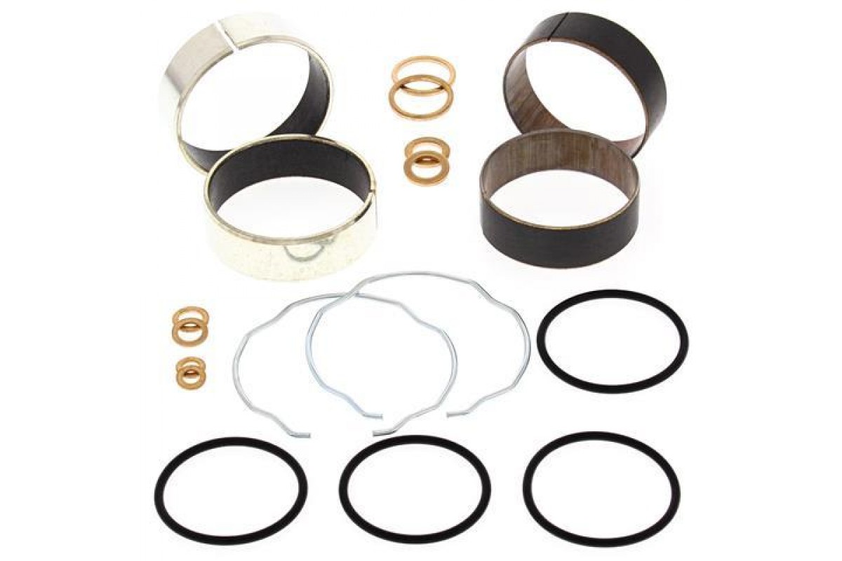 Ремкомплект вилки ALLBALLS 38-6085 призначений для ремонту та відновлення передньої підвіски мотоцикла. Комплект містить направляючі втулки та ущільнювальні елементи, які забезпечують плавну роботу вилки, зменшують люфт і продовжують ресурс підвіски. Розмір втулок: товста втулка — внутрішній діаметр 43 мм, зовнішній 47 мм, висота 15 мм; тонка втулка — внутрішній діаметр 42 мм, зовнішній 44 мм, висота 15 мм. Розмір шайб: 4,0х8,0х1,0 дві штуки, 6,0х10х1,0 дві штуки, 8,0х13х1,5 мм дві штуки, 15х19х1,7 мм дві штуки. Розмір гумових ущільнювальних кілець: 13х17,5х2,5 мм два штуки, 36х40х2,0 мм два штуки, 34х38х2,0 два штуки, стопорні кільця 56х59х2,0 мм два штуки.