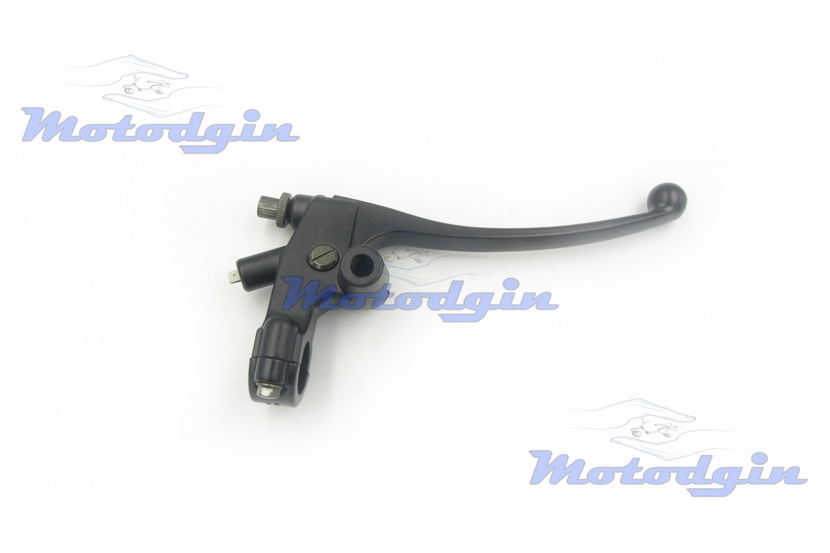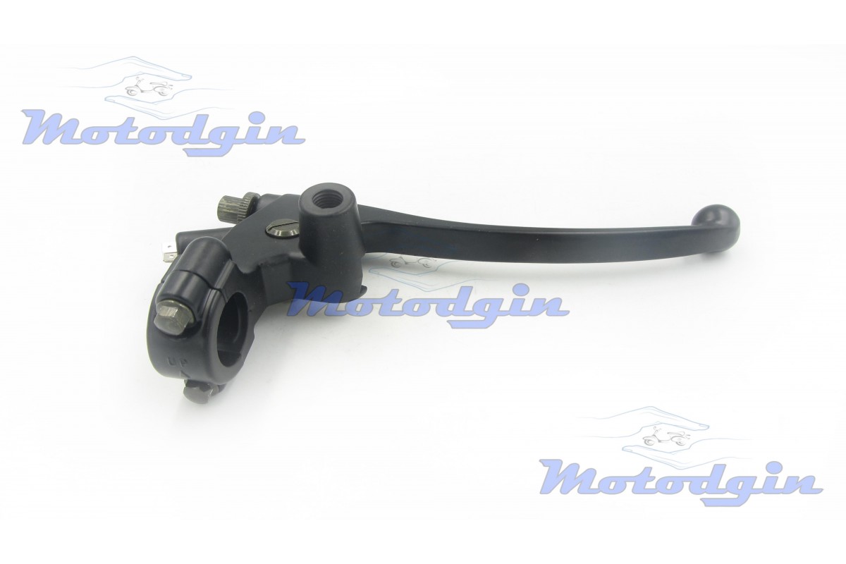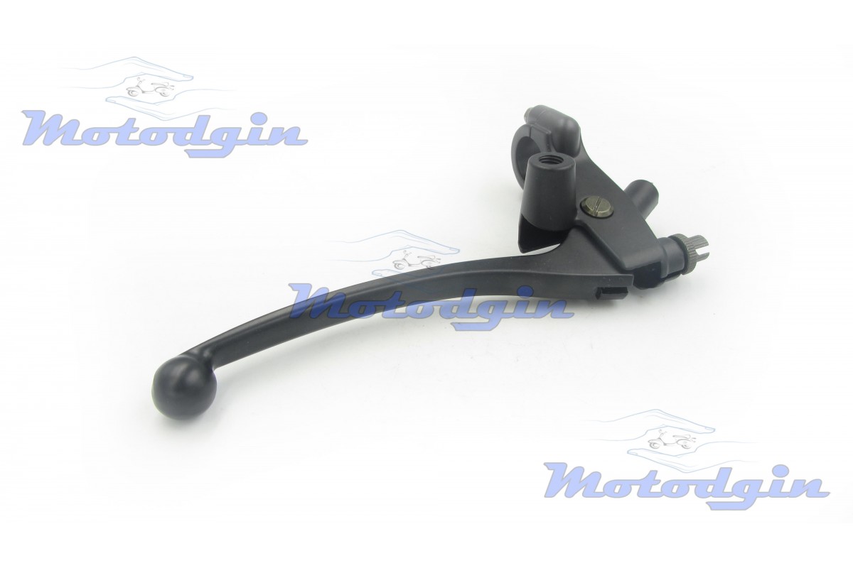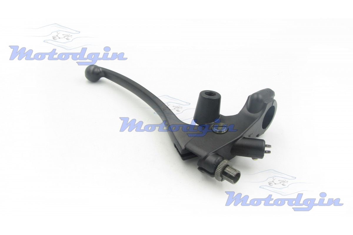 Важіль керма з кріпленням під дзеркало М10 правий. Правий гальмівний важіль поставляється у комплекті з кріпленням, датчиком гальма. Важіль можна встановити на скутер, мопед, моторолер, квадроцикл та іншу мототехніку з діаметром керма не менше 22мм. Орієнтовні розміри: довжина вузла 210мм, довжина важеля 145мм, діаметр внутрішній отвори хомута 22.0мм, діаметр різьблення під дзеркало 10мм. виробник - MG