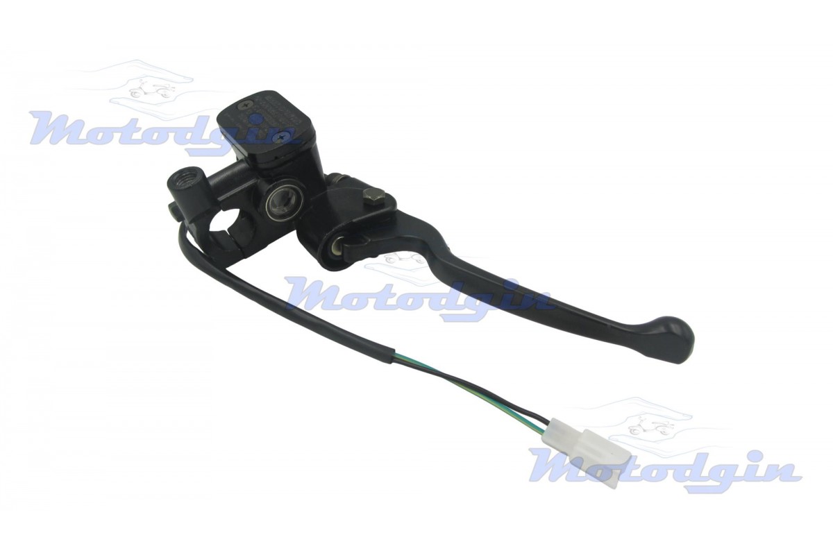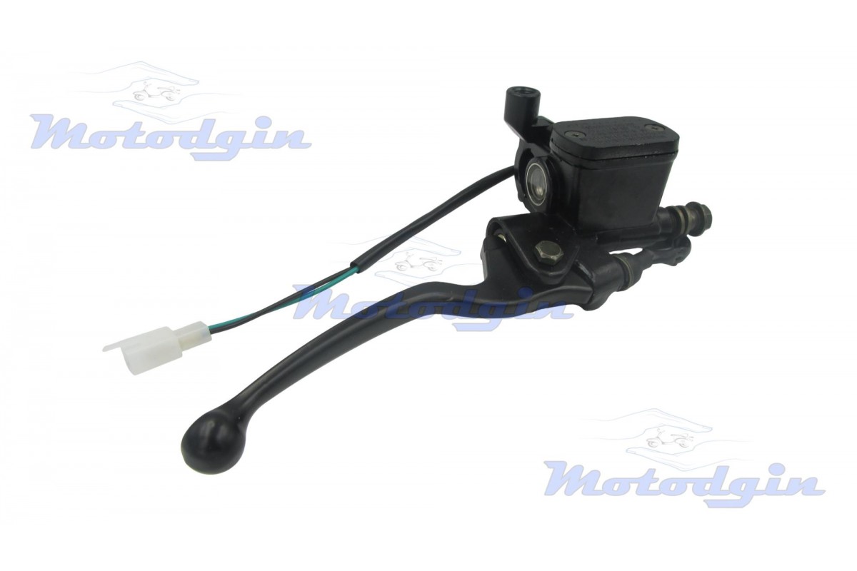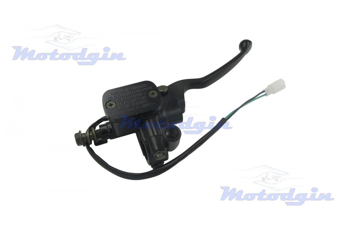 Машинка гальмівна (ГТЦ) Pengsh права чорна. Гальмівна машинка виготовлена з якісних матеріалів максимально наближено до оригіналу. У даній ГТЦ різьба під дзеркало ліва, діаметр М10, в комплекті поставляється з кнопкою включення стоп-сигналу. Хомут кріплення розрахований на діаметр керма від 22 мм, довжина важеля 150 мм, довжина дроту 340 мм, підключення роз'єм два контакти, гальмівний штуцер 10 мм. Виробник - MG