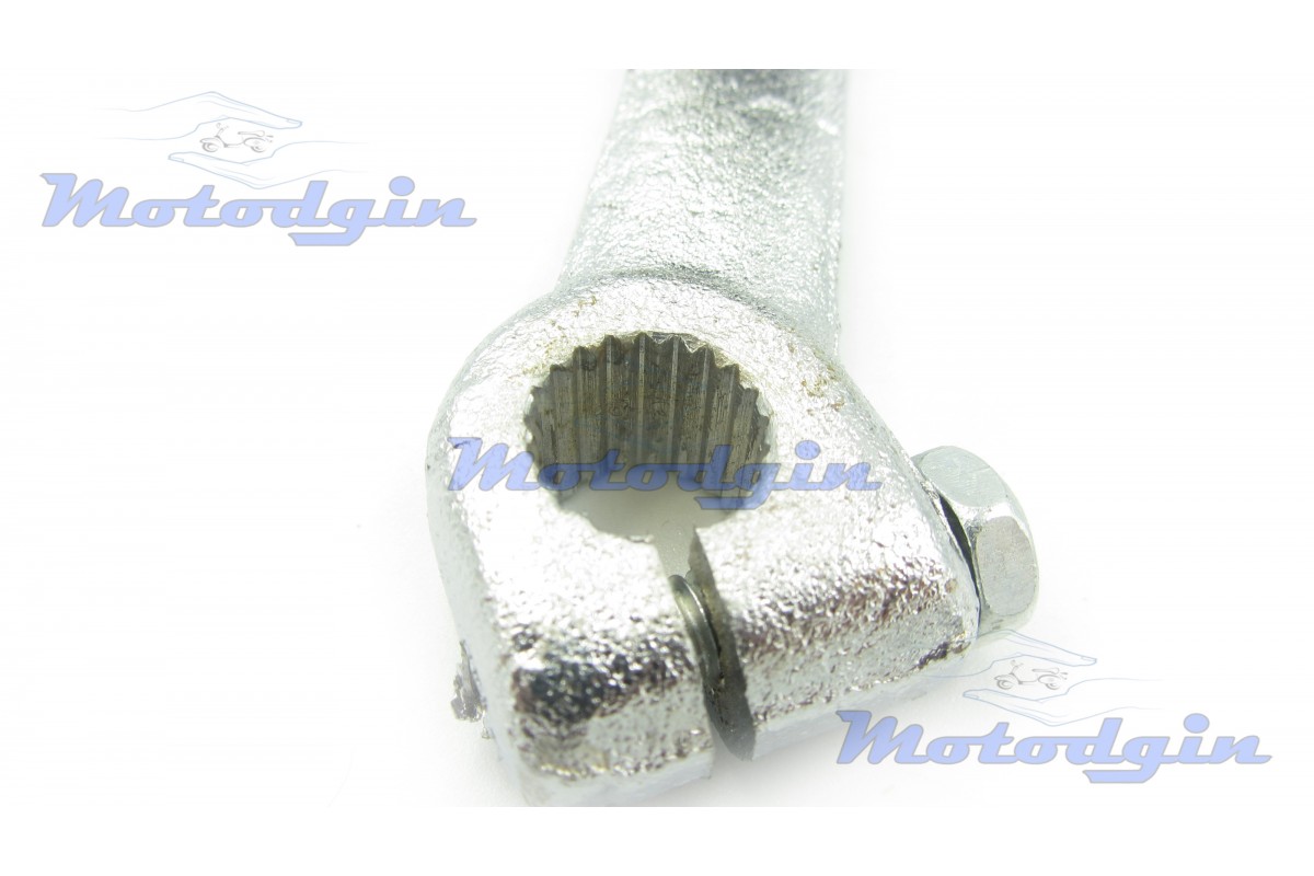 Лапка перемикання передач GS125. Лапка перемикання передач виготовлена з якісних матеріалів у суворій відповідності до оригіналу. Довжина ніжки 115мм, шліць великий, діаметр отвору шліцевої частини 11мм, діаметр отвору кріплення ніжки 12мм, ширина важеля під ногу 42мм. виробник - MC