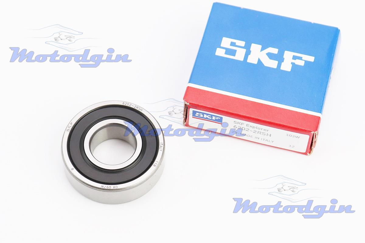 Підшипник 6202 вторинного валу КПП Yamaha YBR125 сторона зчеплення (Ямаха ЮБР 125) Підшипник валу коробки передач Ямаха ЮБР виготовлений максимально наближено до оригіналу. Внутрішній діаметр 15 мм, зовнішній 35 мм, глибина 11 мм, даний підшипник встановлюється на праву сторону вторинного валу, сторону зчеплення. Виробник - SKF